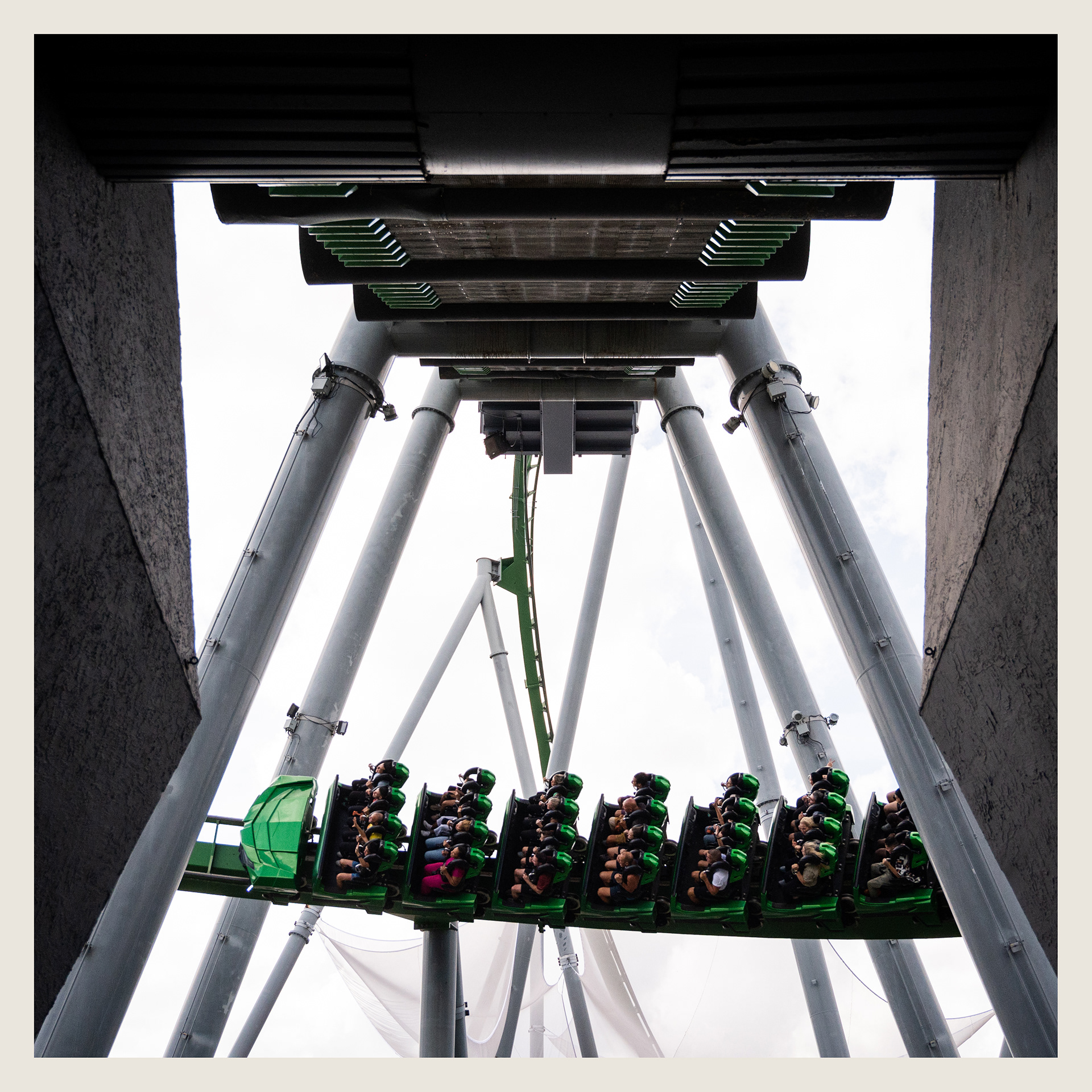 I'm a big fan of rollercoasters that have some sort of interaction with guests exiting the ride - whether intentional or not. Anyone getting off of Hulk and quickly walking down the exit tunnel is going to be greeted by this train whizzing by, framed by its own launch tunnel structure. Thought it would make a cool photo.
