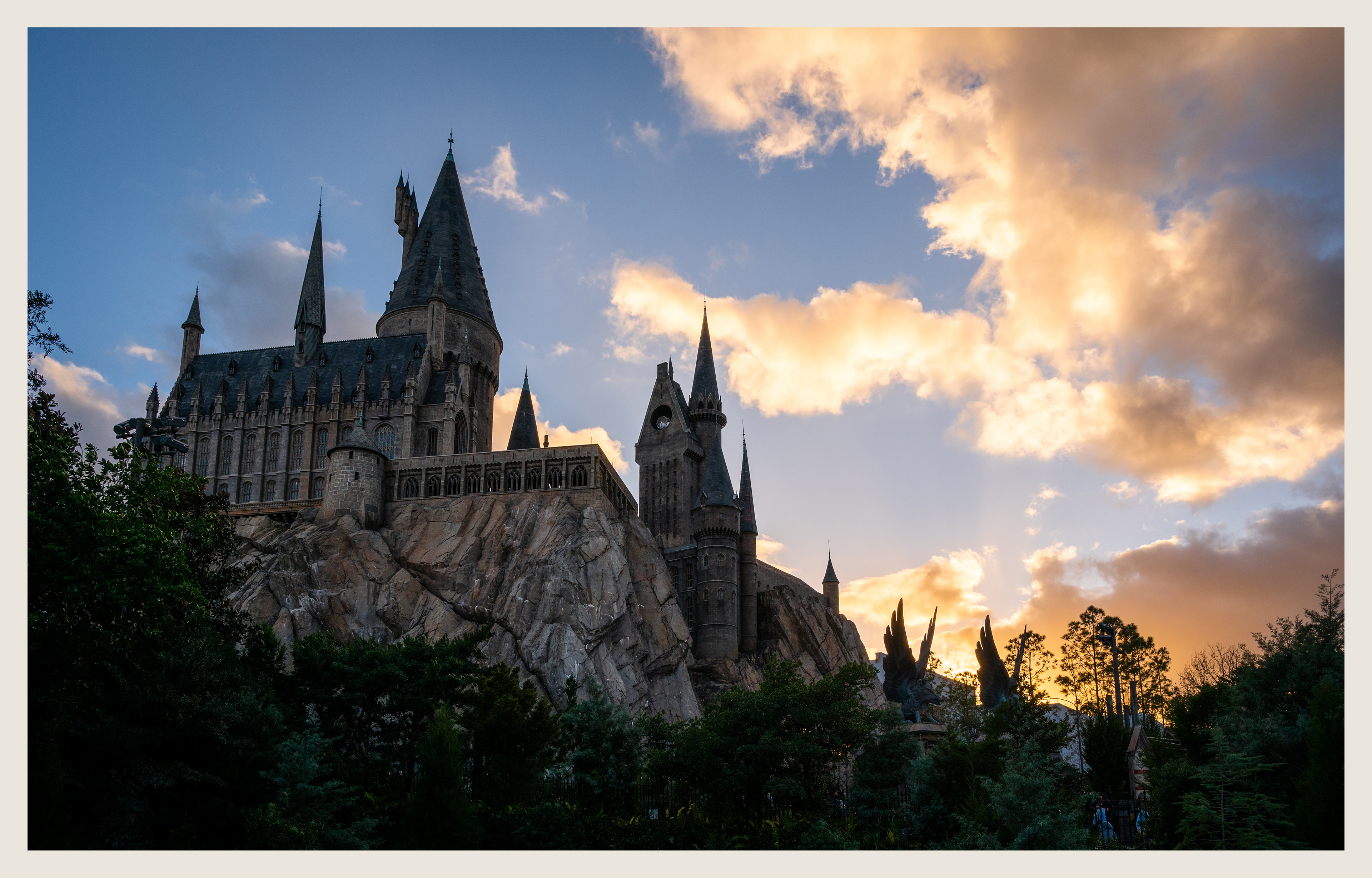 Through Port of Entry, the area completely opens up to a panoramic view of the entire park. Did my best to make an interesting composition of this sure-to-become iconic view of Velocicoaster and Hogwarts, by creating a simple focus stack with these cool emblems along the waterfront.