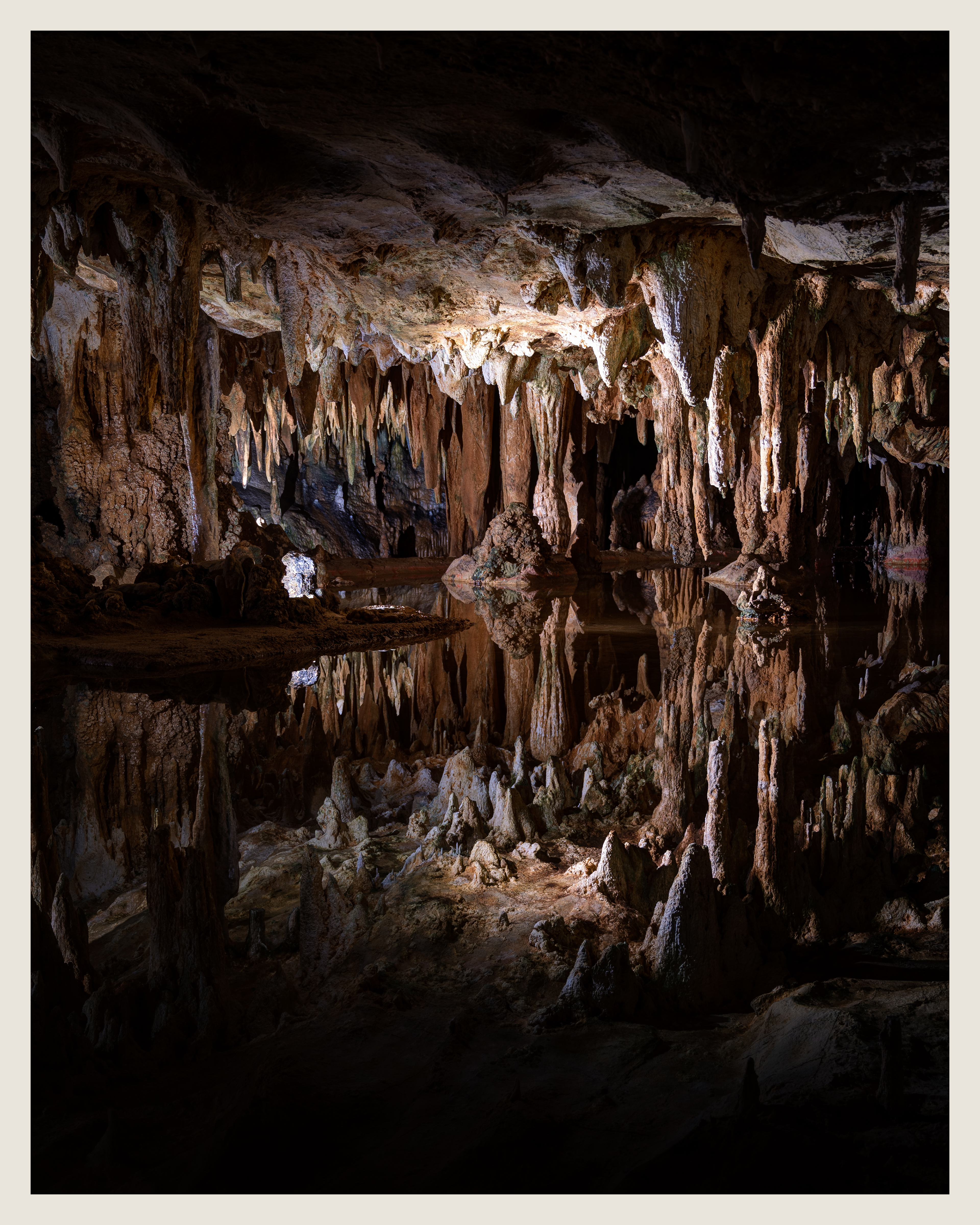 Dream Lake offers a convincing optical illusion of a deep floor full of large stalagmites, when in reality it's just a reflection of the ceiling on inches-deep water. There's much more to it than what I've included in this composition, and it's admittedly pretty disorienting to view in person.