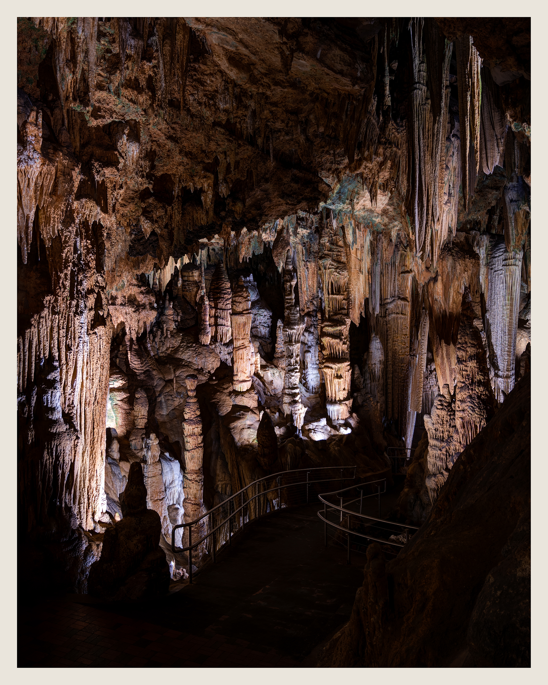 Giant's Hall is probably my favorite location in the caverns, with its lofty ceiling and towering Totem Pole formations. The huge stalactites and draperies hanging from the ceiling felt like daggers pointing downward, especially from this elevated angle. Gathering a sense of scale here is difficult (a common theme of my photo set), but hopefully the walkway at the bottom of the frame helps to convey the massive feeling of this space.